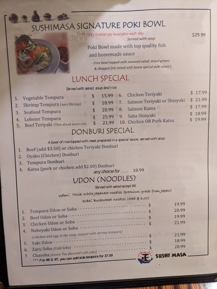 Welcome to Sushi Masa, an inviting gem nestled in San Jose, CA, at 5363 Camden Ave. Sushi Masa proudly serves authentic Japanese cuisine, making it a favorite among locals and visitors alike. With a menu that showcases fresh sushi rolls, delectable tempura, and creative appetizers, every dish is crafted with care and precision.